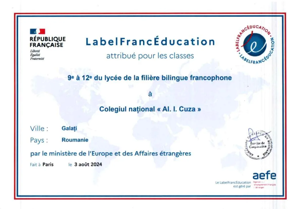 Școală membră a rețelei de licee bilingve francofone (elevii de la clasa de filologie bilingv franceză susțin bacalaureat francofon).